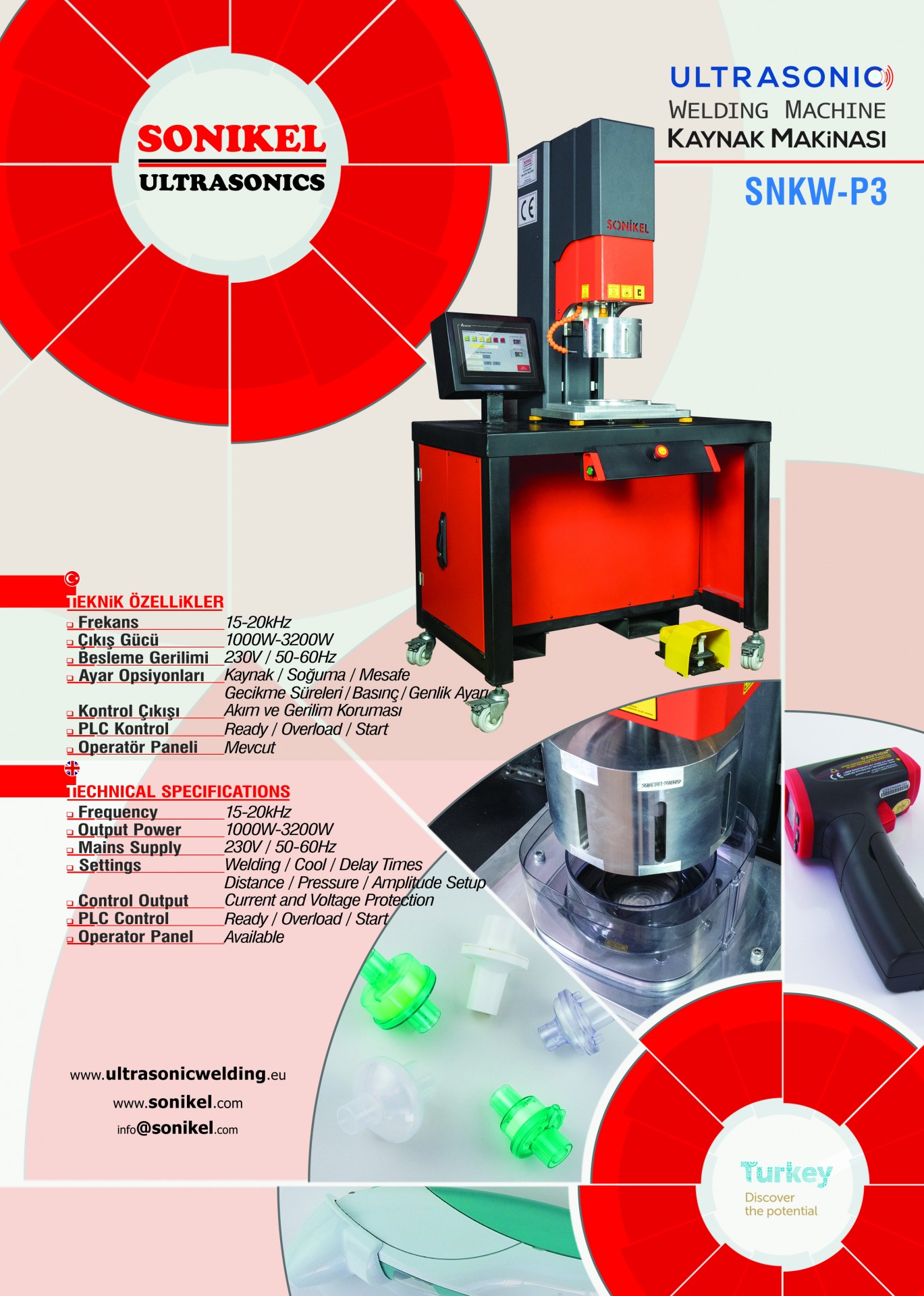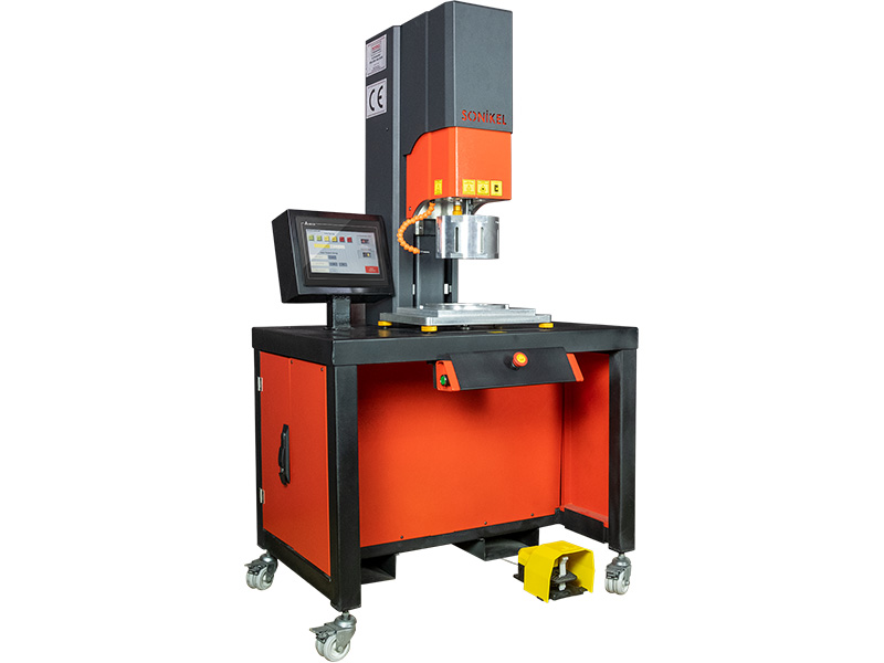 The SNKW-P3 ultrasonic welding machine is a system designed for small and medium-sized industrial applications consisting of ultrasonic power supply, opening panel and pneumatic structure. SNKW-P3 is a mobile machine with lockable wheels. All machine settings can be made from the operator panel, the prescriptions can be stored in memory.
