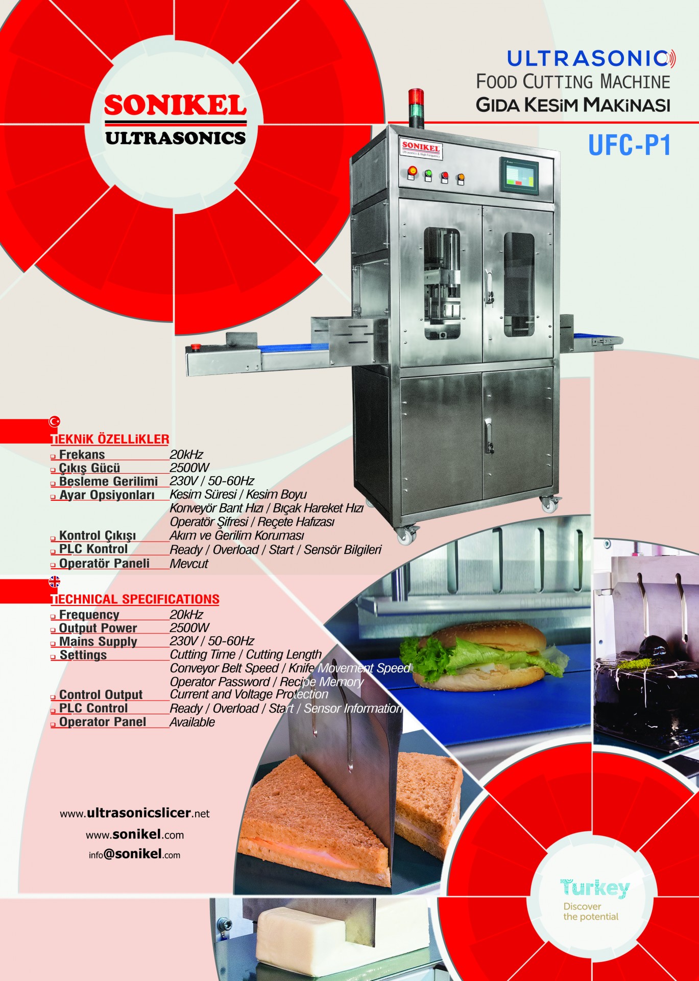 UFC-P1 General Features: Sonikel ultrasonic 12 years of ultrasonic and automation experience in the food sector's design and production of UFC-P1 for their customers. The UFC-P1 consisting of a stainless body and titanium alloy blade is 100% suitable for 100% food. It is very frequently preferred because cheddar cheese, honeycomb honey, halva, cake, sandwiches are smooth and fast cutting even in food. Thanks to its bands in the loading and unloading area, it can be easily used next to the production line or even integrated into the production line. The UFC-P1 segment can be specially designed according to the dimensions of the food product and product.