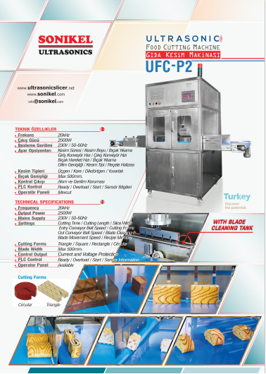 UFC-P2 General Features: Sonikel Ultrasonic designs and manufactures the UFC-P1 machine for its customers in the food industry with its 12 years of ultrasonic and automation experience. Consisting of a stainless body and a titanium alloy blade, the UFC-P1 is 100% food-grade. It is frequently preferred even in sticky or easily breakable foods such as cheddar cheese, honeycomb honey, halva, cake, sandwich, as it cuts smoothly and quickly. Thanks to its bands in the loading and unloading area, it can be easily used next to the production line and even integrated into the production line. UFC-P2 can be specially designed according to the size and type of the food product to be cut. Thanks to its 4-axis blade movement and washing station, it can remove many cutting forms (round, triangle, square, rectangular) and can automatically clean the blade.